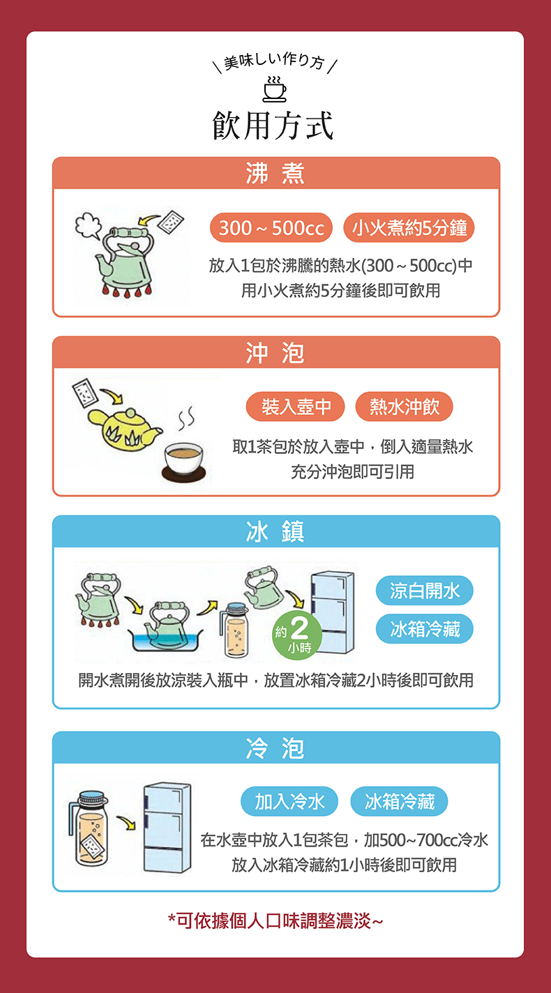 u 冷泡熱沖皆適宜,冷泡只需30分鐘,就能讓紅豆精華釋放於茶湯中,並充分釋放紅豆的焙炒香氣及濃醇尾韻,溫潤回甘。