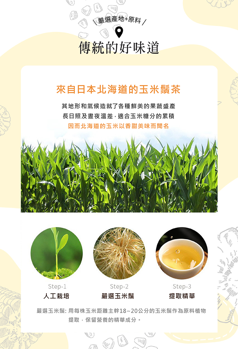 u 嚴選採用「100%北海道生產的玉米鬚及玉米胚芽」製成,讓您吃的健康又安心。