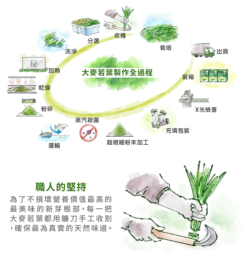 為了不破壞營養價值最高最美味的新芽根部,我們 都用「鐮刀手工收割」,只為了確保最真實的天然風味。