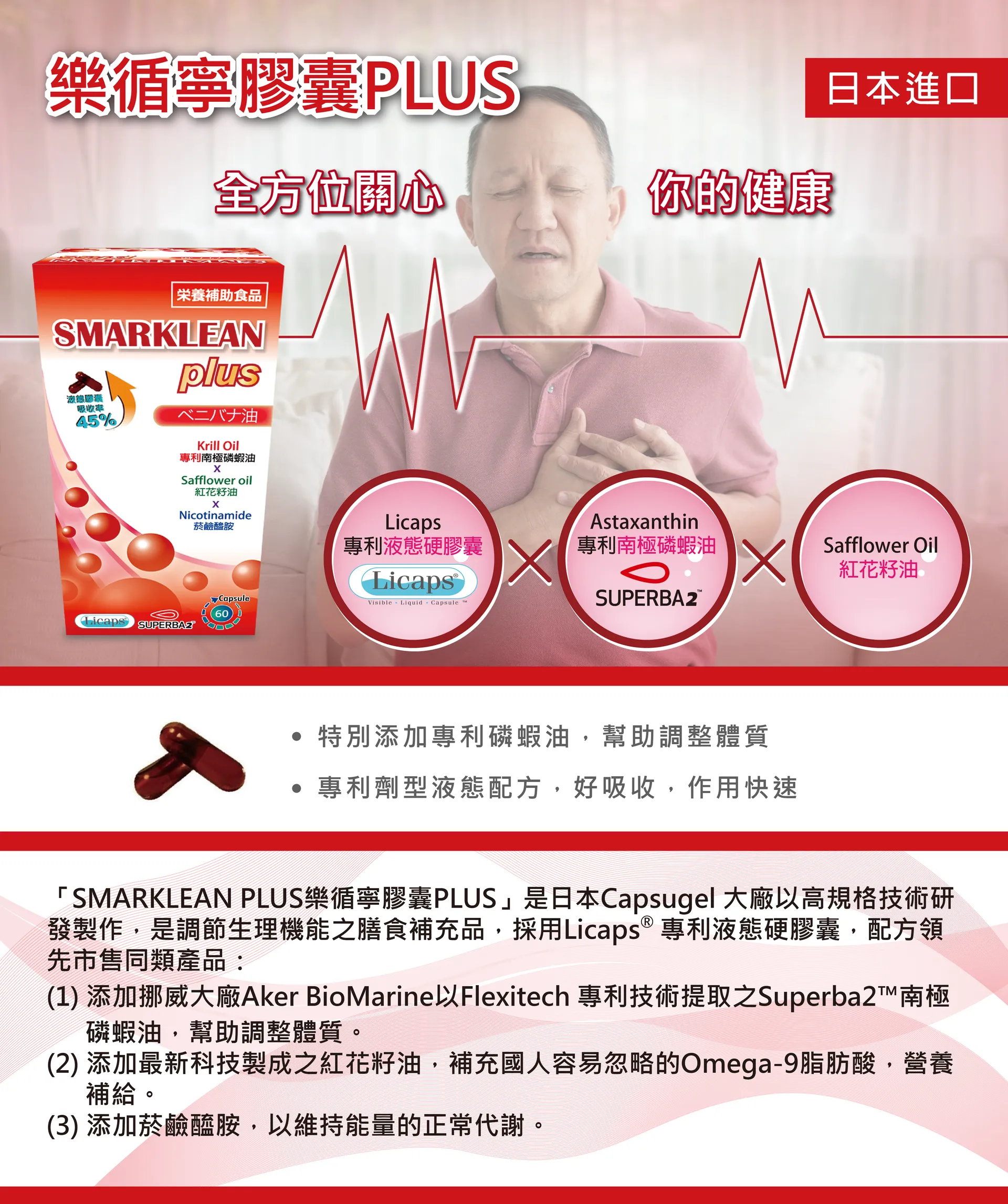 樂循寧膠囊PLUS採用Licaps®專利液態硬膠囊技術,專為調節生理機能設計。此產品含有Superba2™南極磷蝦油,提供比魚油更易吸收的Omega-3脂肪酸;高油酸紅花籽油,補充Omega-9脂肪酸;以及菸鹼醯胺,幫助維持正常的能量代謝。