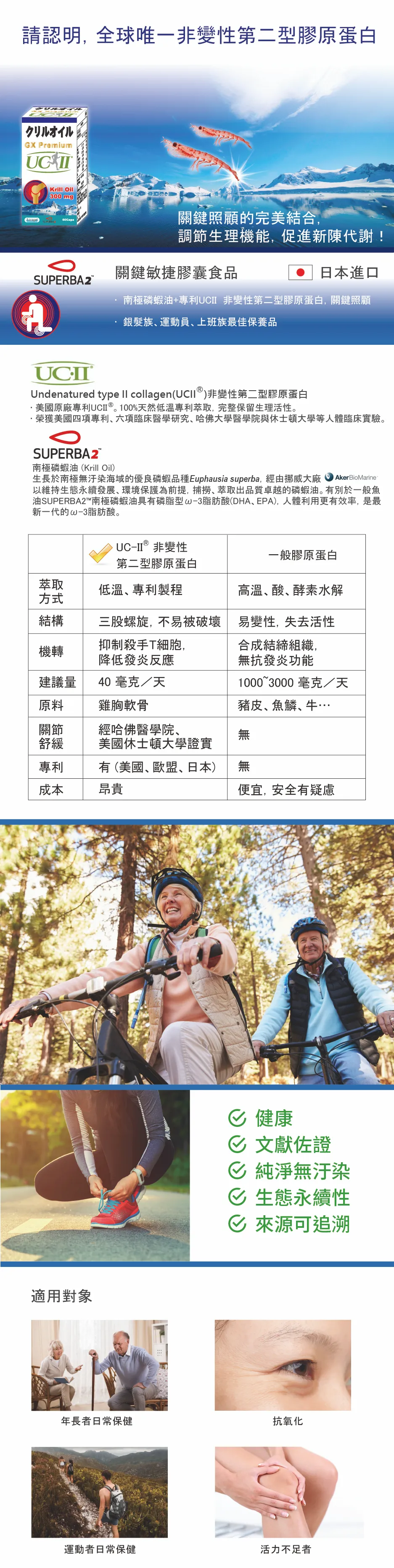 關鍵敏捷膠囊含有300mg南極磷蝦油與40mg美國專利UC-II®(未變性II型膠原蛋白),這些成分能提供有效的營養補充與抗氧化作用,有助於維持行動靈活,適合日常保健使用。